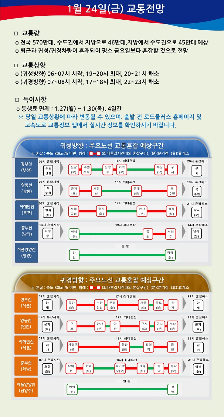 연휴 시작 전 1월 24일(금)은 퇴근과 귀성/귀경차량이 혼재되어 평소 금요일의 교통량과 비교해서 많이 혼잡할 것으로 전망됩니다. 1월 24일(금)에 출발을 계획하고 있다면 퇴근 시간 이전에 출발하는 것이 좋습니다. 그리고 1/27(월요일)부터 전국적인 대설과 한파, 1/28 ~ 1/29 이틀간 남부 지방 폭설 일기예보가 있어 운전에 각별한 주의가 필요합니다.