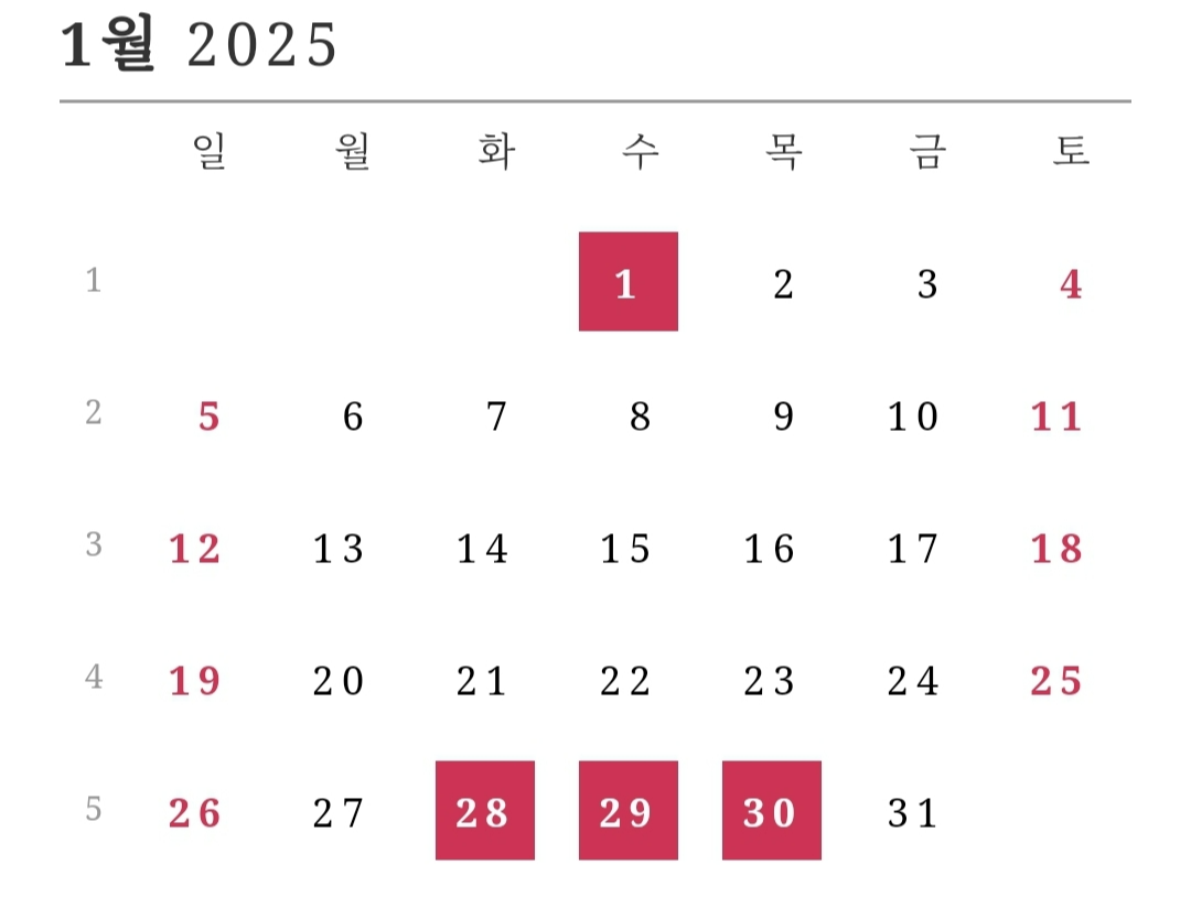 2025년 설 구정 연휴는 1월 27일 월요일부터, 1월 30일 목요일까지이고 설날은 1월 29일 수요일입니다.