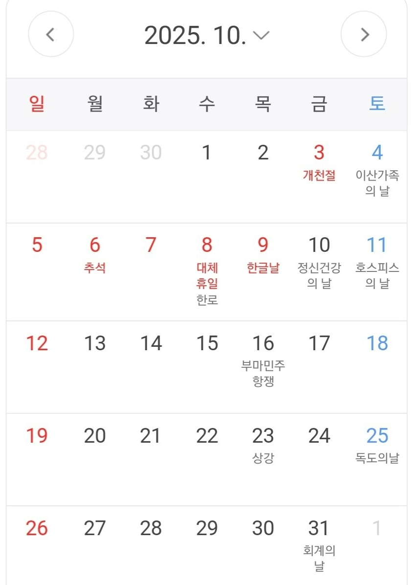 2025 추석 연휴는 10/5(일) ~ 10/7(화)까지